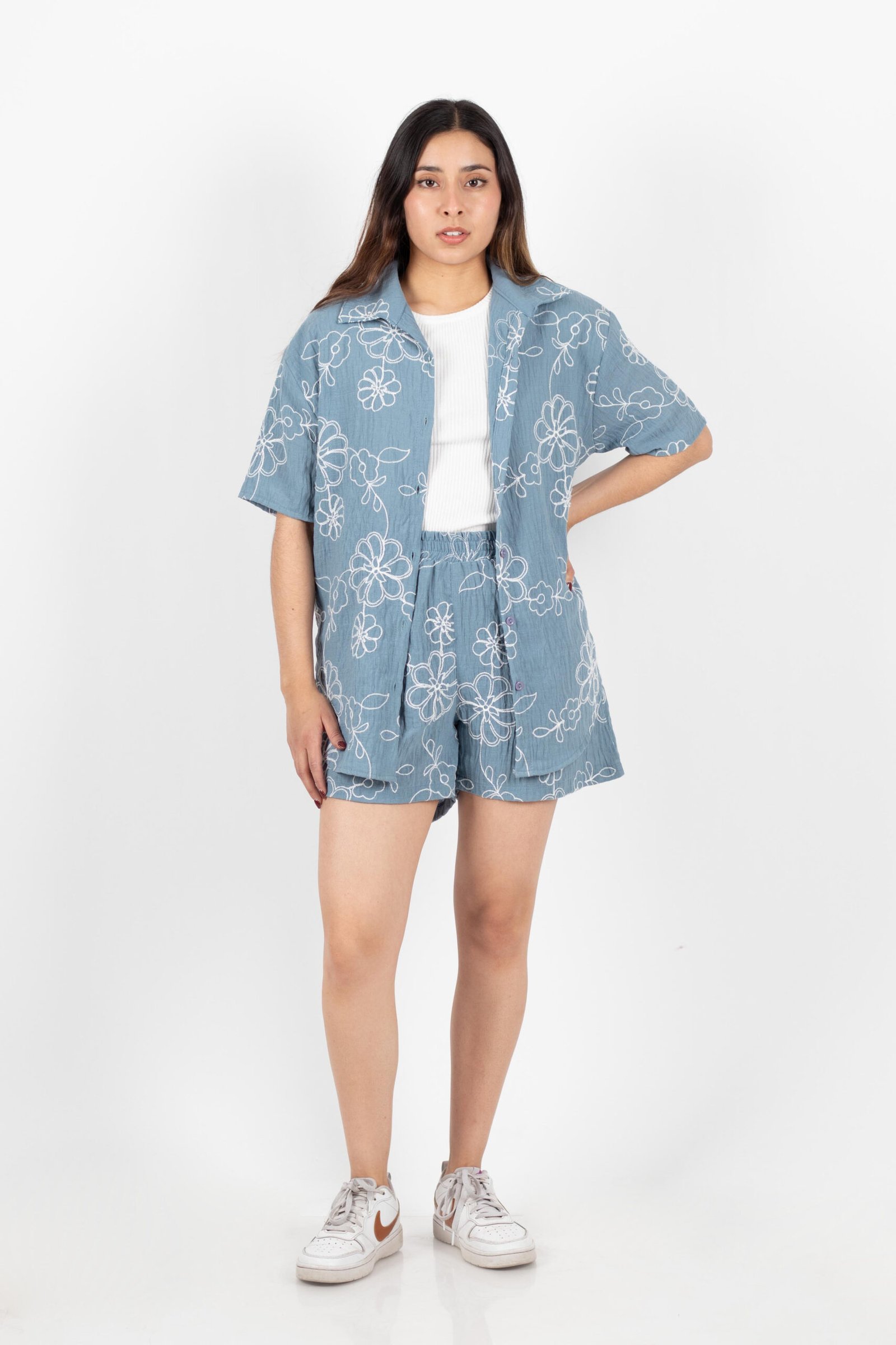 El look perfecto para tus próximas vacaciones o un domingo relajado. Este set coordinado destaca por su delicado estampado de flores en trazos blancos sobre un fondo azul denim suave. Es esa combinación ganadora de “arreglada pero informal” que te permite estar cómoda todo el día sin perder el estilo.